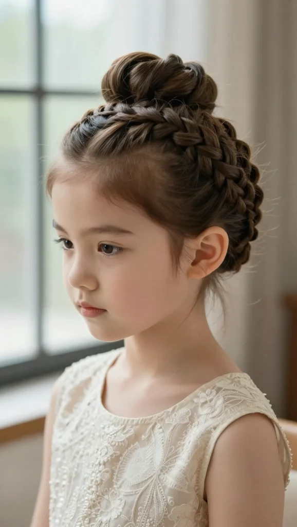 A crown braid wraps around the head like a halo. It’s a beautiful option for birthdays, weddings, or school events. This style keeps hair fully off the face and creates a princess-like appearance that kids adore.