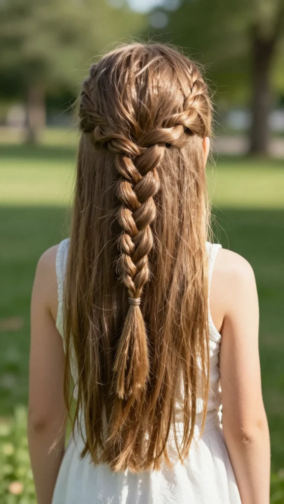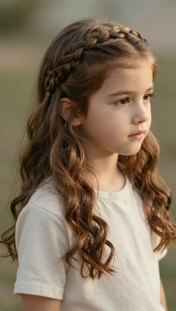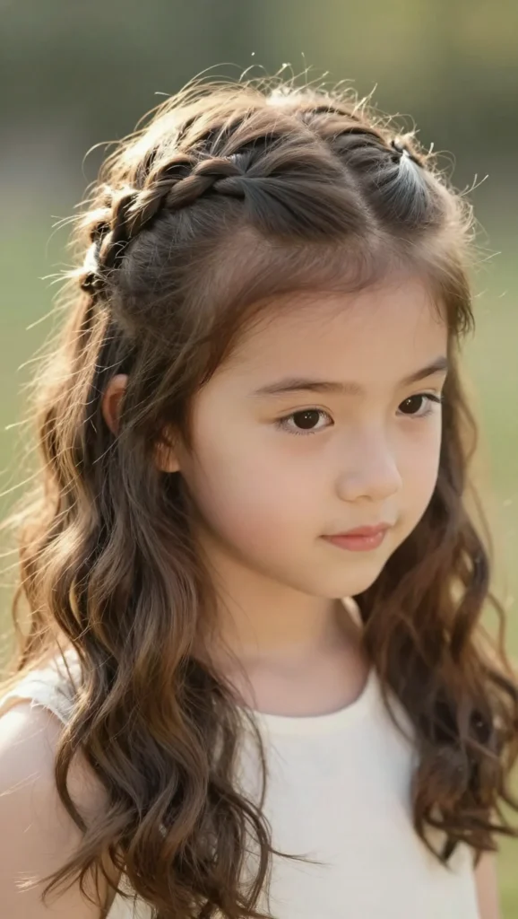 This hairstyle braids the top half of the hair while leaving the rest loose. It’s perfect for kids who love wearing their hair down but still want it out of their face.