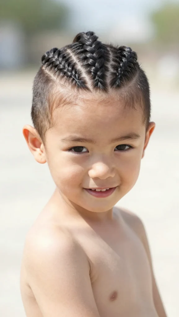 A braided mohawk runs down the center of the head, with the sides either braided or slicked back. It’s a bold and fun choice for kids who love unique hairstyles.