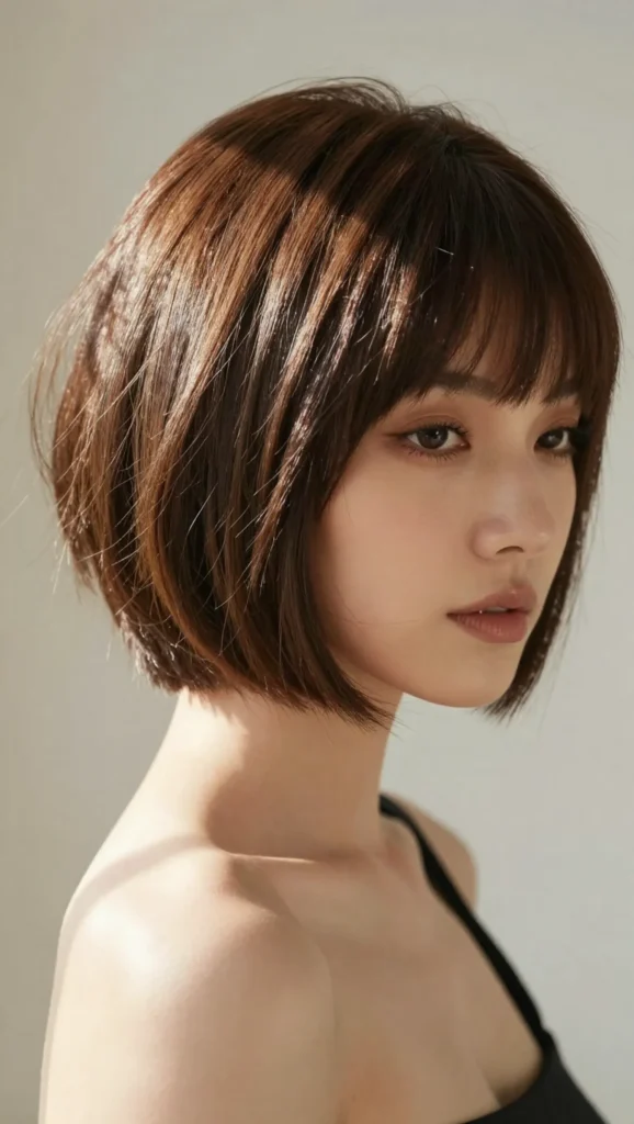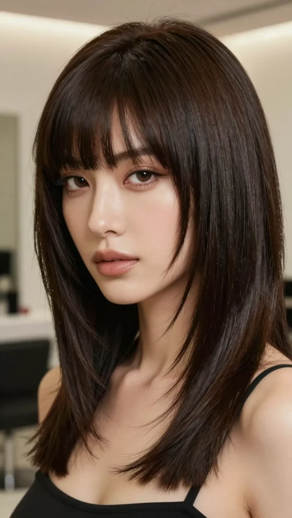 Side-swept bangs add softness and frame the face beautifully. This style works well with thick hair because it balances volume.