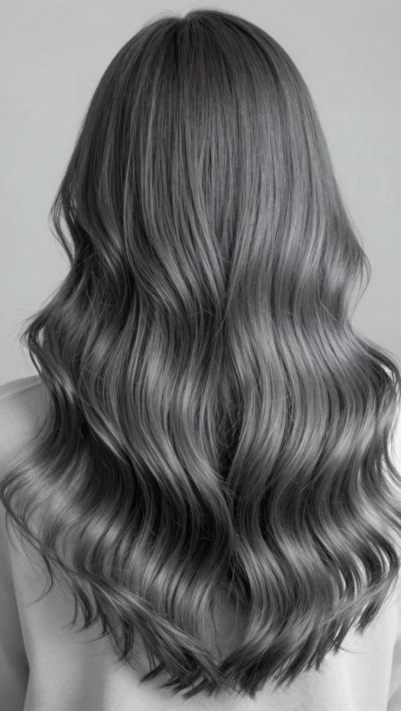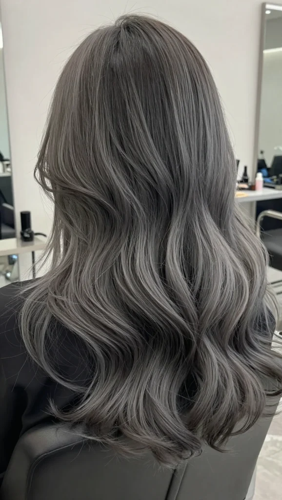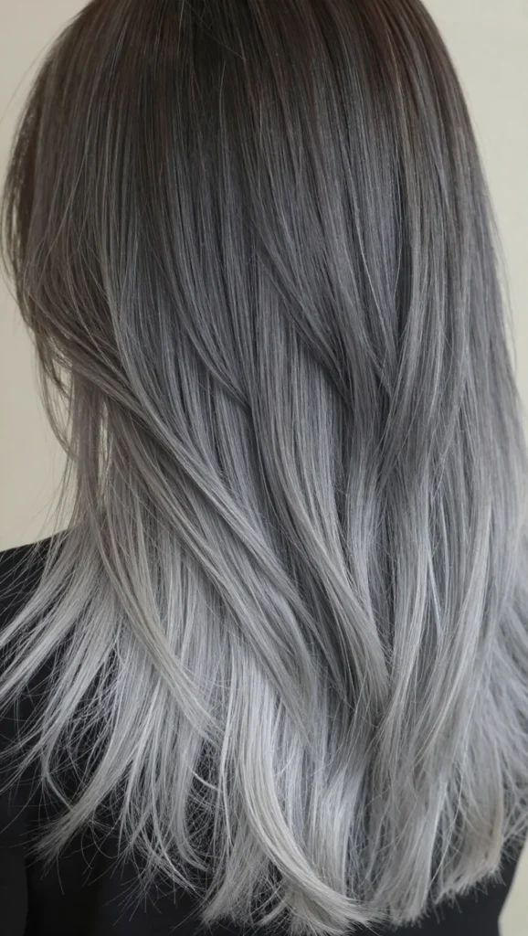 Smoky gray balayage blends darker roots with soft gray ends, creating a natural gradient. It’s low-maintenance and ideal for those new to gray tones.