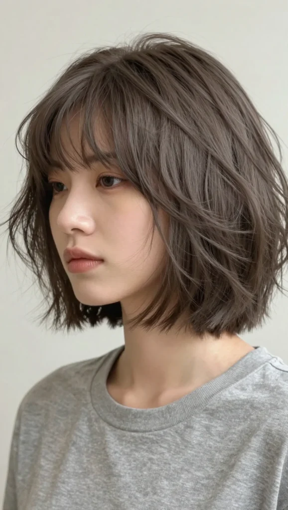A choppy bob haircut adds texture and structure to a round face. The uneven layers create angles that help counterbalance soft facial features.