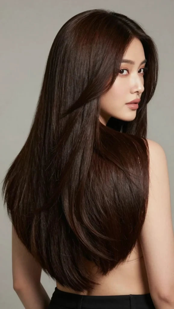 A V-cut layered hairstyle adds depth and shape to long hair. The V shape in the back creates a slimming visual effect and enhances hair movement.