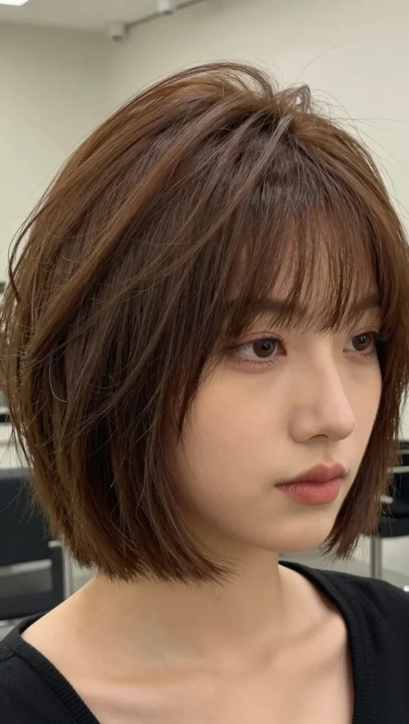 A choppy bob with uneven layers adds texture and dimension. This prevents the hair from sitting too flat against the jawline.