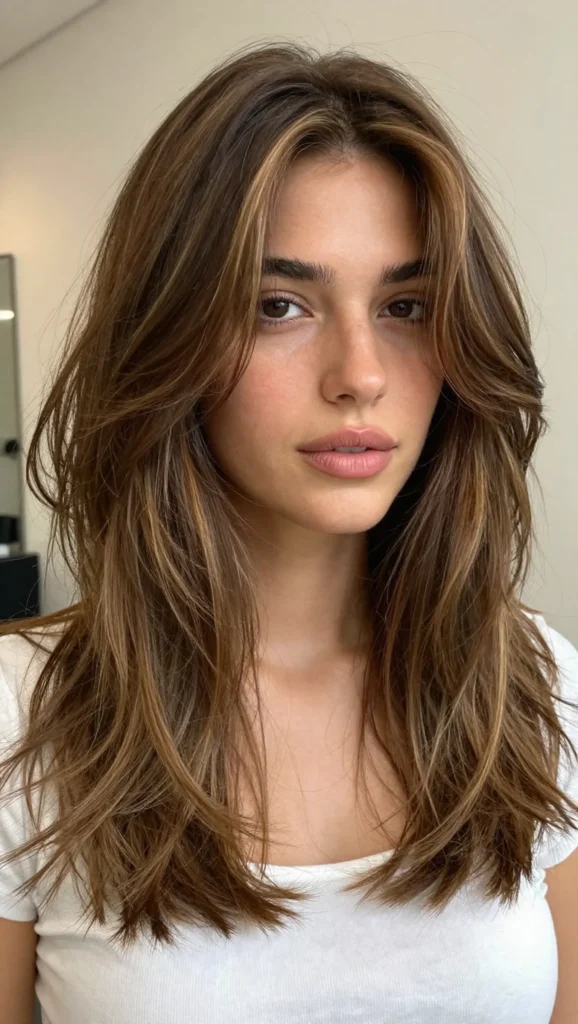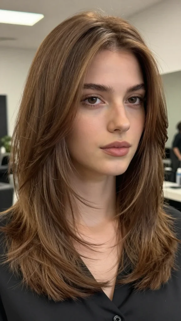 A long layered haircut is one of the most flattering choices for a square face. Layers help break up the straight lines of the jaw and add softness around the face. The gradual layers create movement and reduce the boxy appearance that square faces sometimes have.