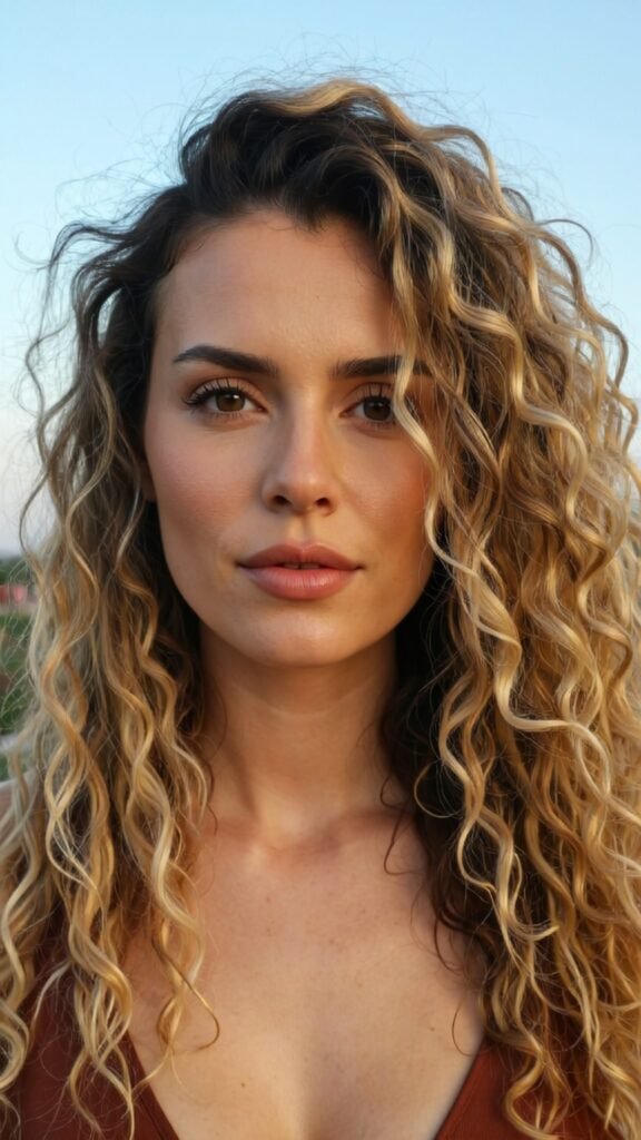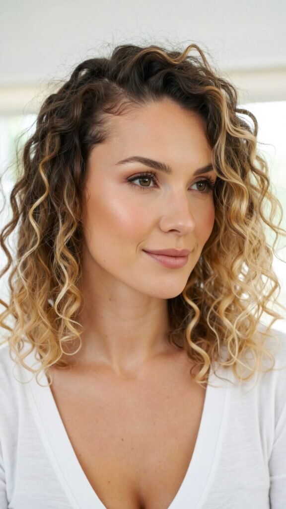 Ombre brings the drama—darker roots with honey blonde mid-lengths and ends. The contrast emphasizes your curl pattern and gives a soft gradient effect.