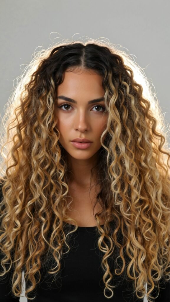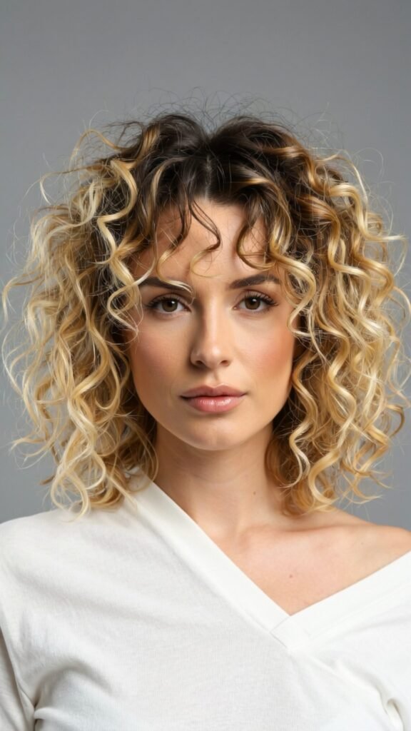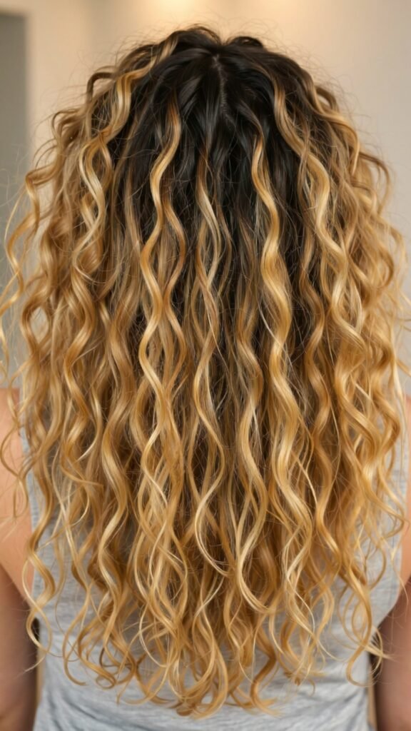 Dark roots paired with honey blonde curls are trendy, modern, and practical. The root contrast gives a soft, natural look while keeping touch-ups minimal.
