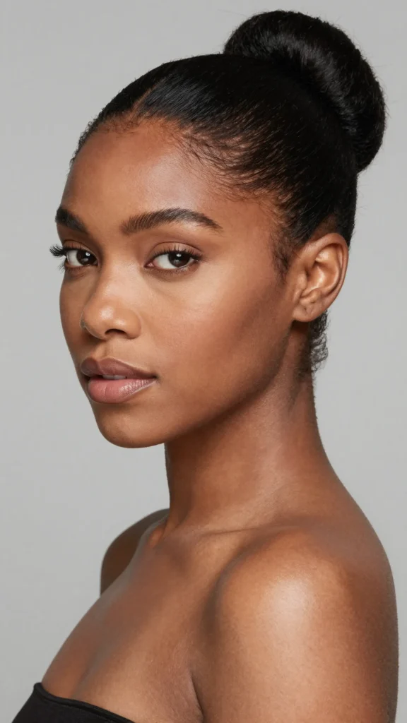 Hair is gathered at the nape of the neck and styled into a bun using minimal tension.