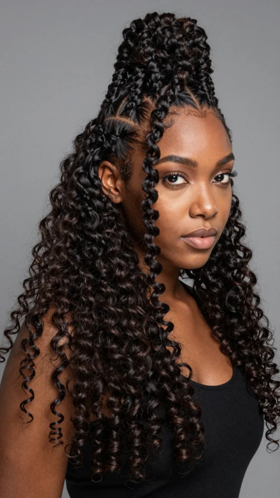 Sides are pinned, braided, or twisted upward while the center remains full and curly.