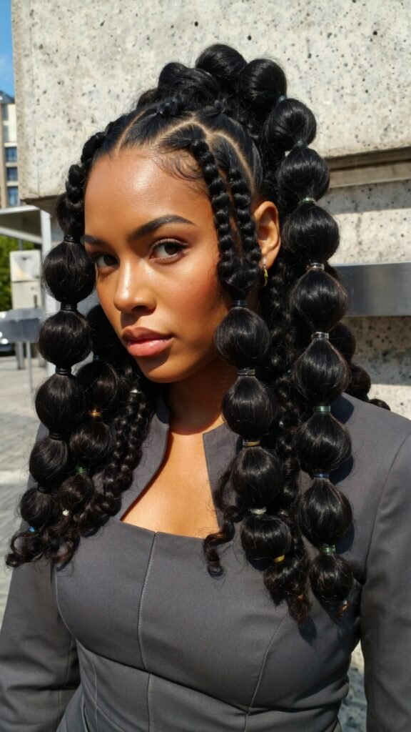 This modern twist on classic cornrows introduces bubble-style ponytail sections at the end. The contrast between sleek braids and voluminous bubbles makes this one of the freshest braided looks of the year.