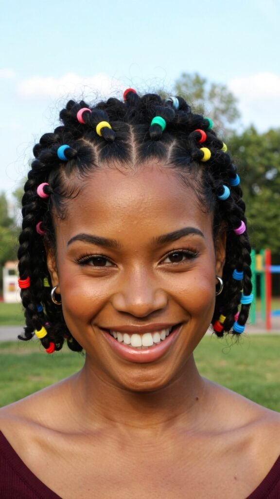 – Short hair: Rubber band braids, braid-to-bun styles, bob braids