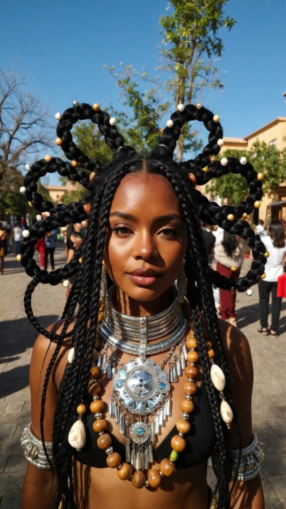 This artistic braided hairstyle features small sections woven into geometric honeycomb shapes that wrap into an elegant updo. It’s creative, modern, and guaranteed to turn heads.