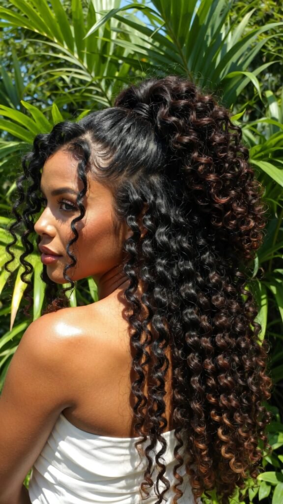– Long hair: Mermaid braids, waterfall braids, passion twist ponytails