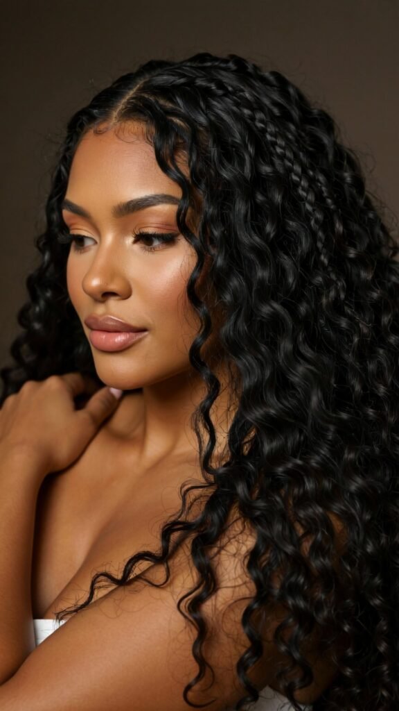 Tiny micro braids paired with loose, natural curls at the ends create a gorgeous combination of texture. This hybrid braided hairstyle blends control with movement.