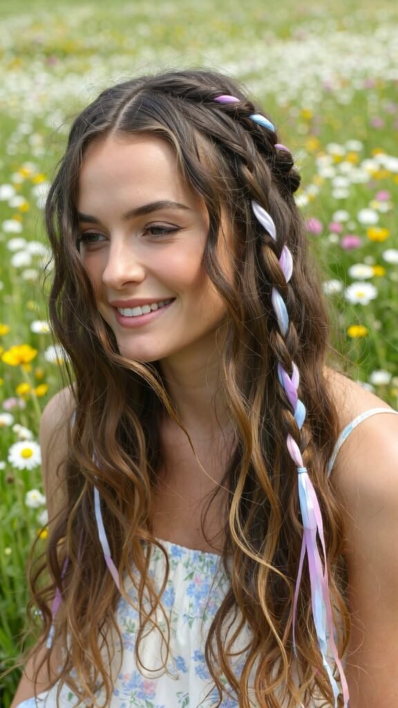 Waterfall braids are already gorgeous, but adding colorful ribbons makes this trend completely new. They create a soft, cascading effect while the ribbon adds a pop of color. It’s perfect for festivals, weddings, or vacation photoshoots.
