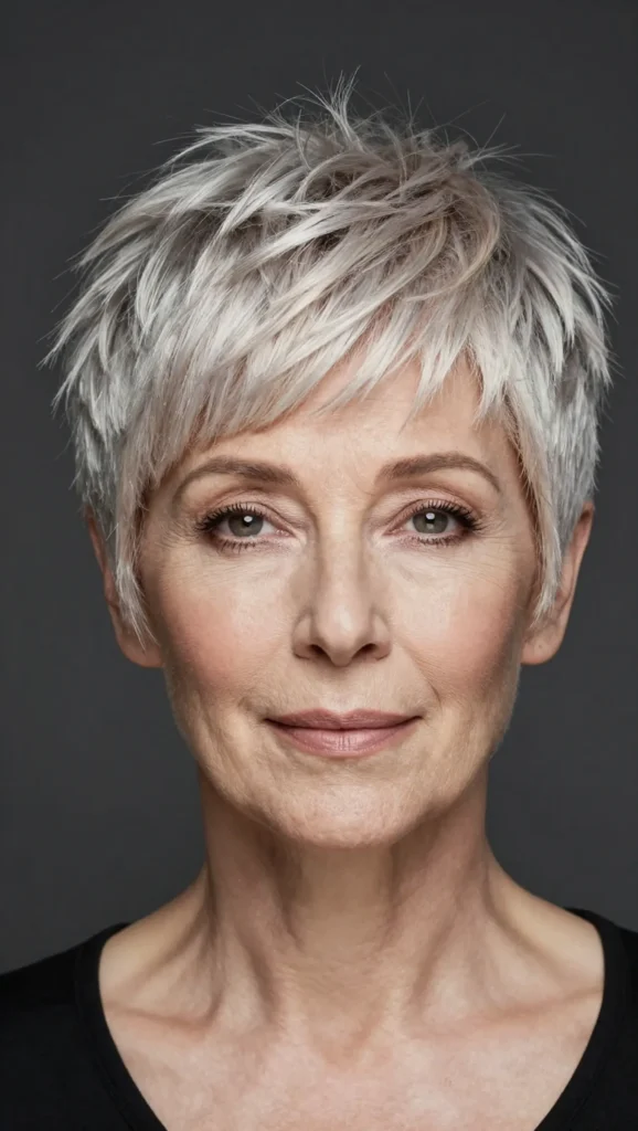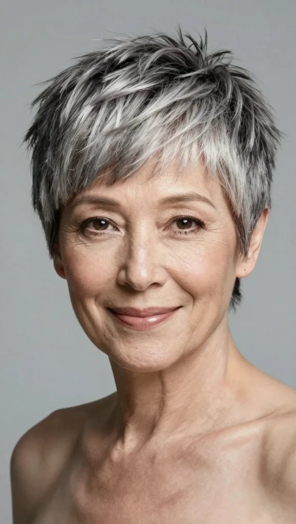 The silver pixie cut celebrates natural gray hair beautifully. This haircut enhances silver tones while maintaining a fresh and modern look.