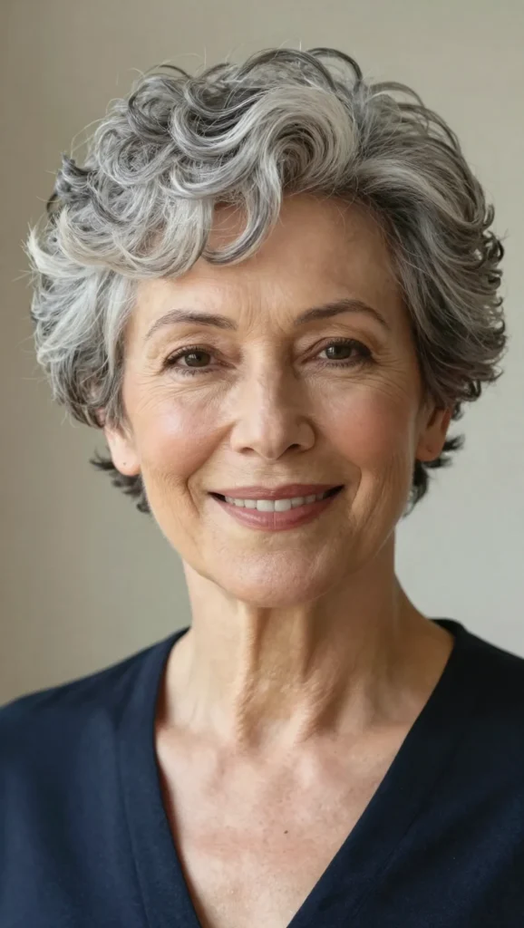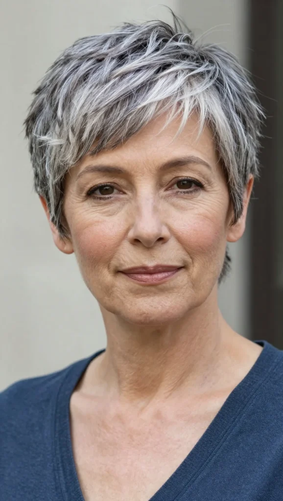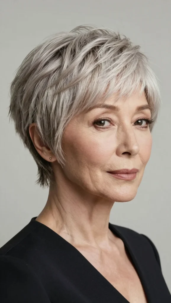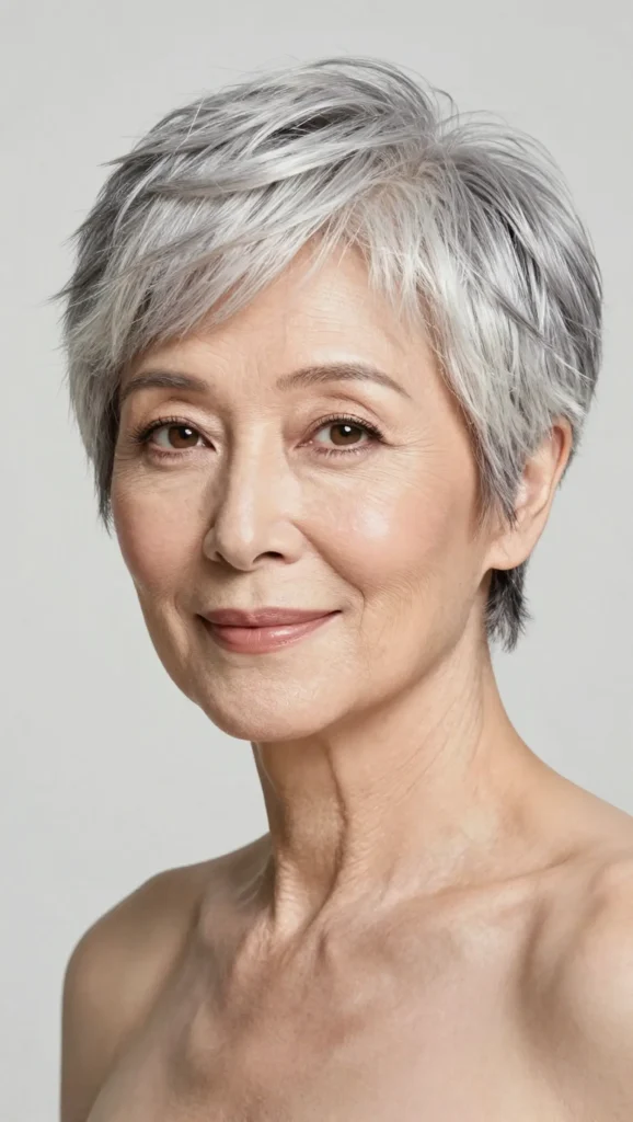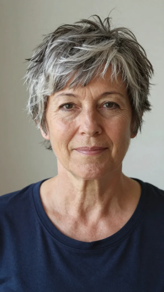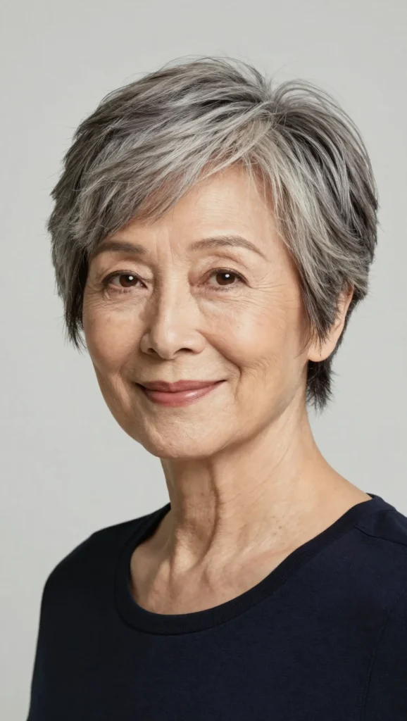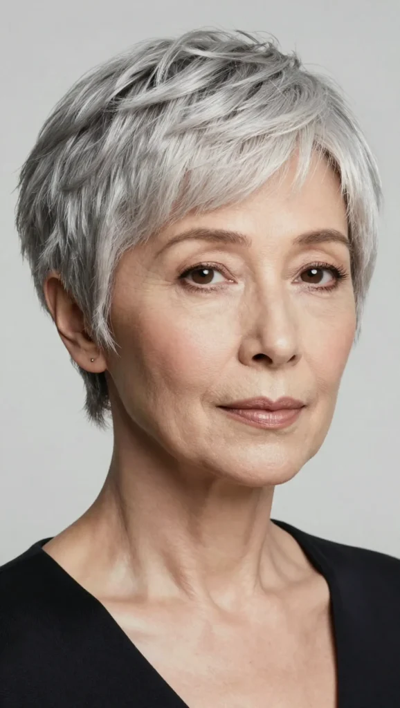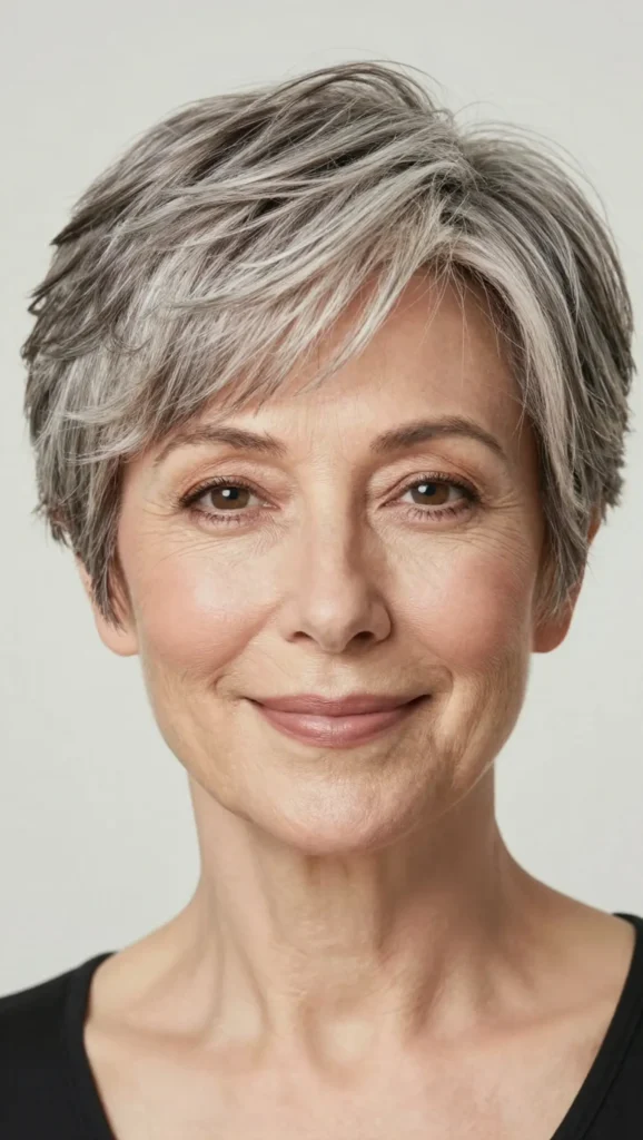 This cut works especially well for fine hair because it adds subtle volume without requiring heavy styling. A soft pixie also complements natural gray or silver tones beautifully.