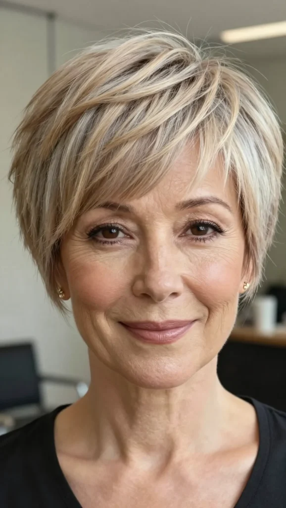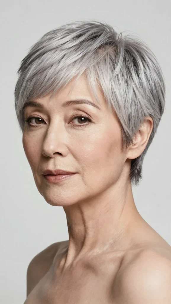 A pixie with side-swept bangs is one of the most flattering options for older women. The bangs soften facial features and help minimize forehead lines.