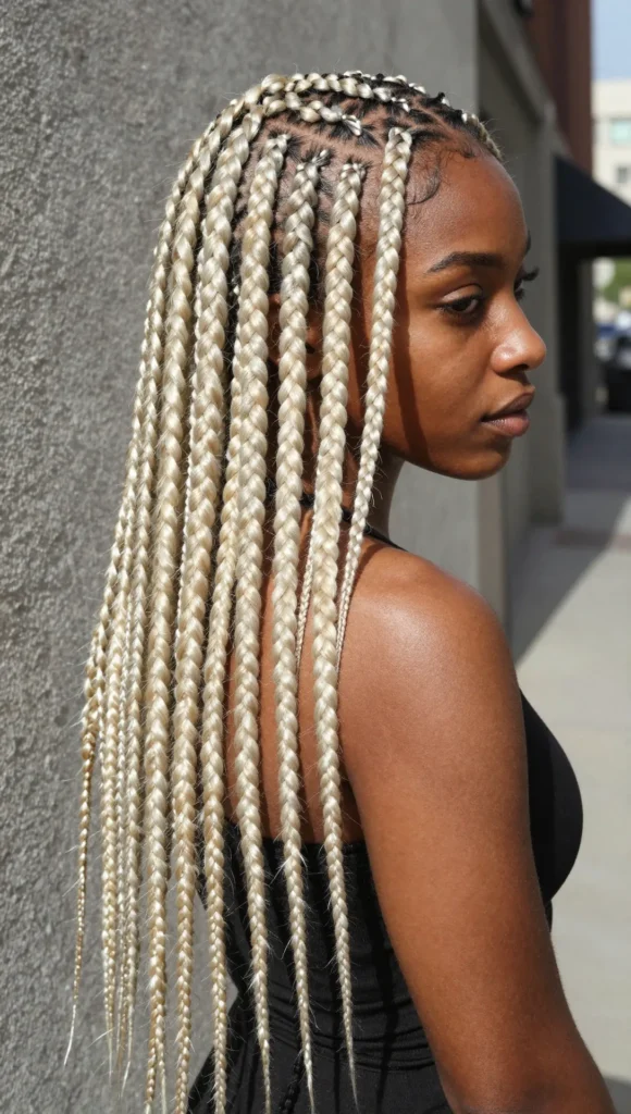 Classic box braids in platinum blonde make a bold, fashion-statement protective style.