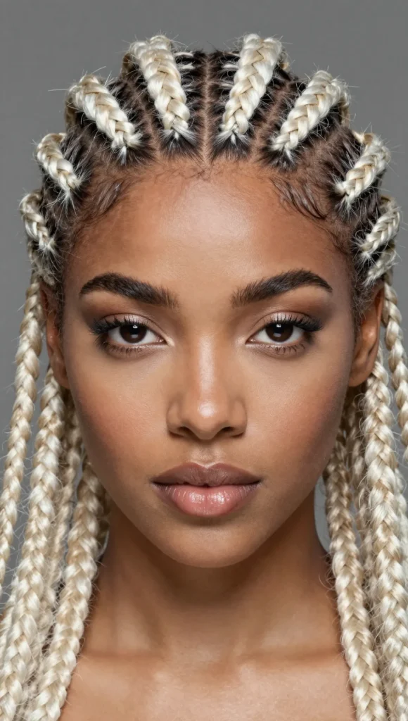 Clean and stylish, platinum blonde cornrows are perfect for protective styling with a bold edge.