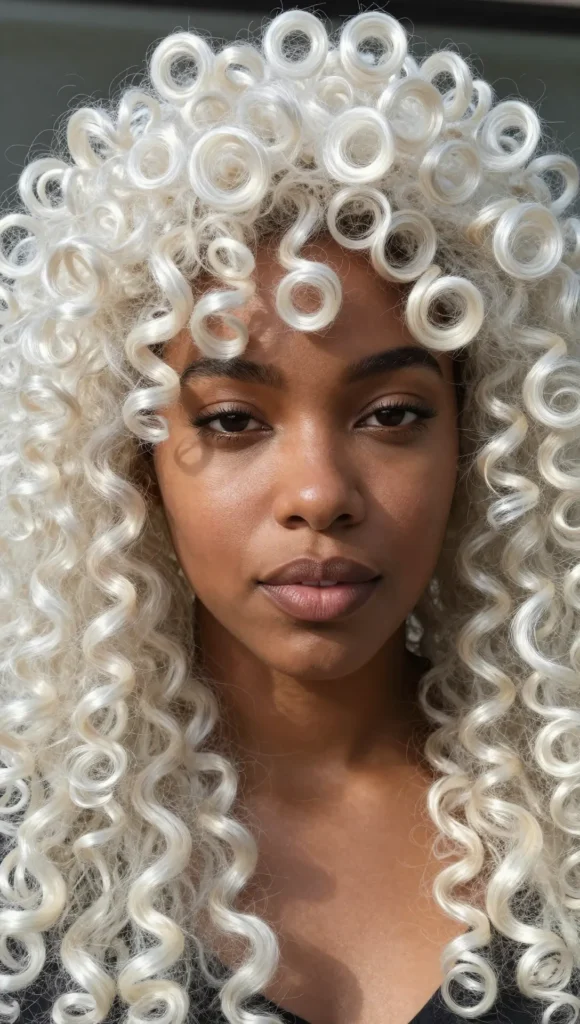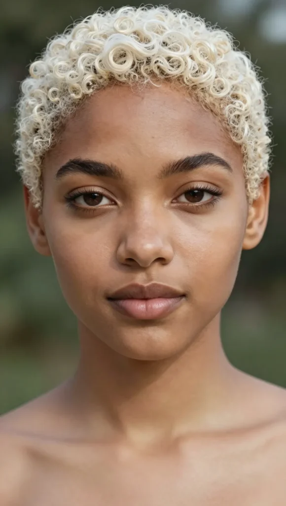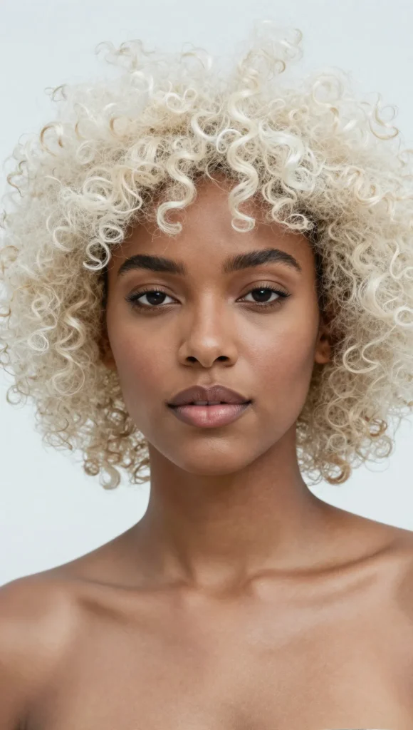 Embrace natural texture with a bold platinum blonde afro. The contrast between tight curls and icy color creates a dramatic, modern look.