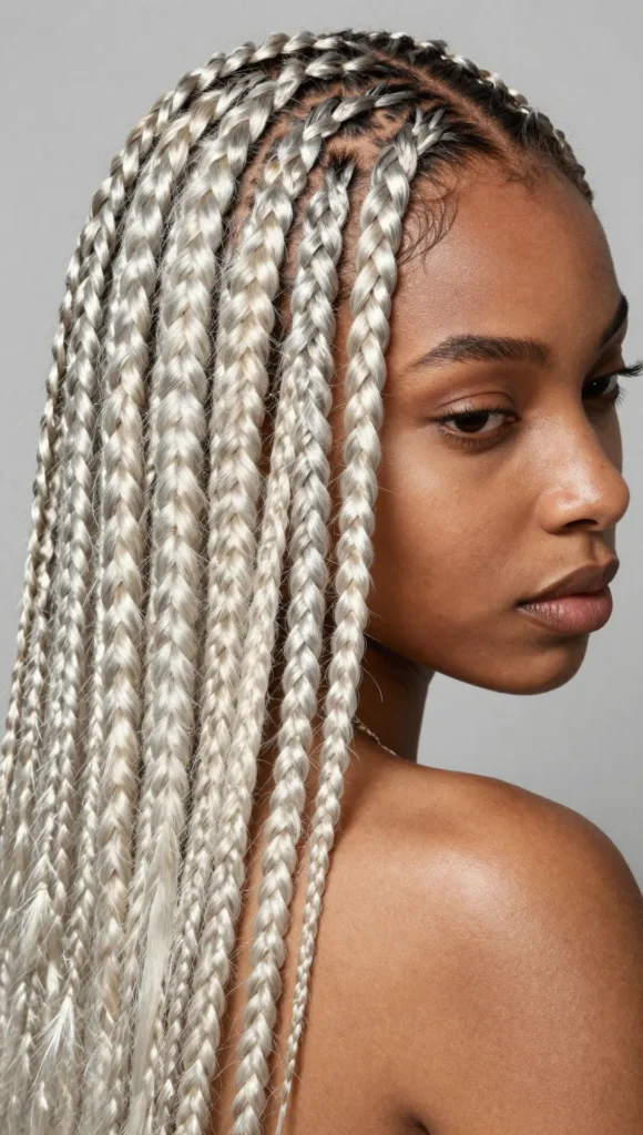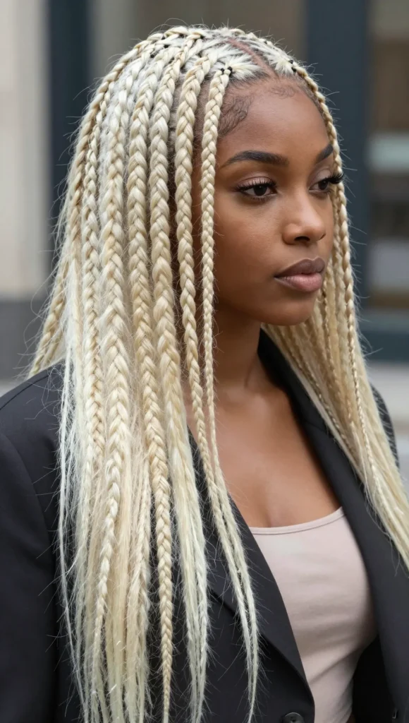 Protective and stylish, platinum blonde knotless braids are lightweight and trendy, ideal for low-maintenance beauty.