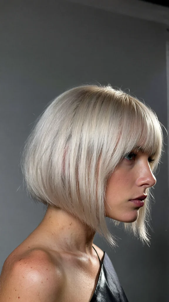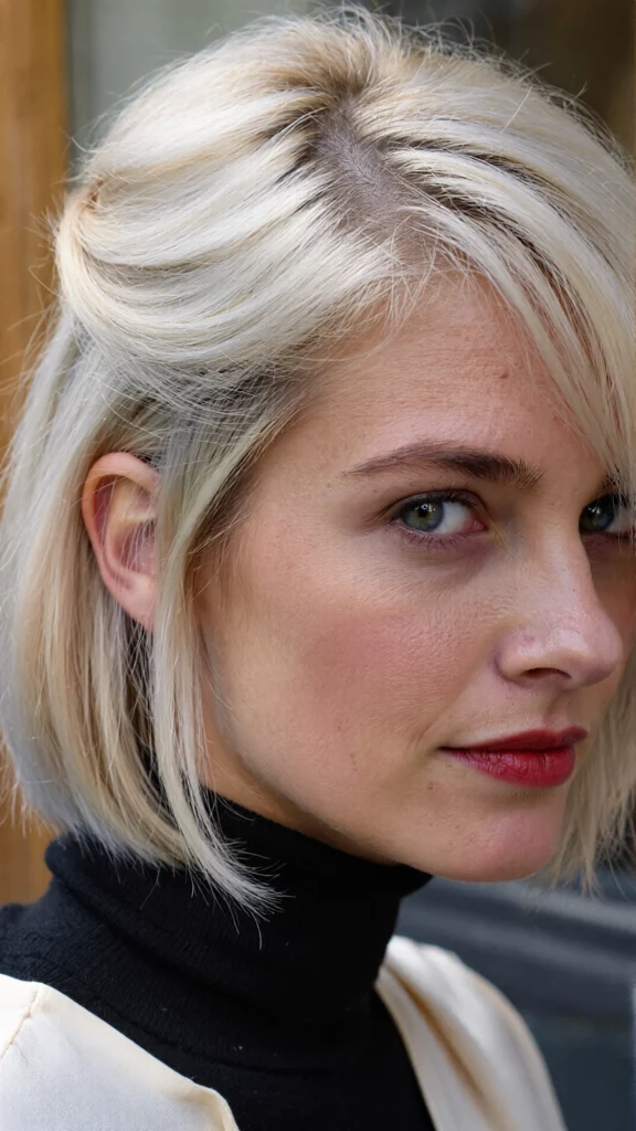 A timeless chin-length bob with a crisp platinum finish that looks polished and elegant.