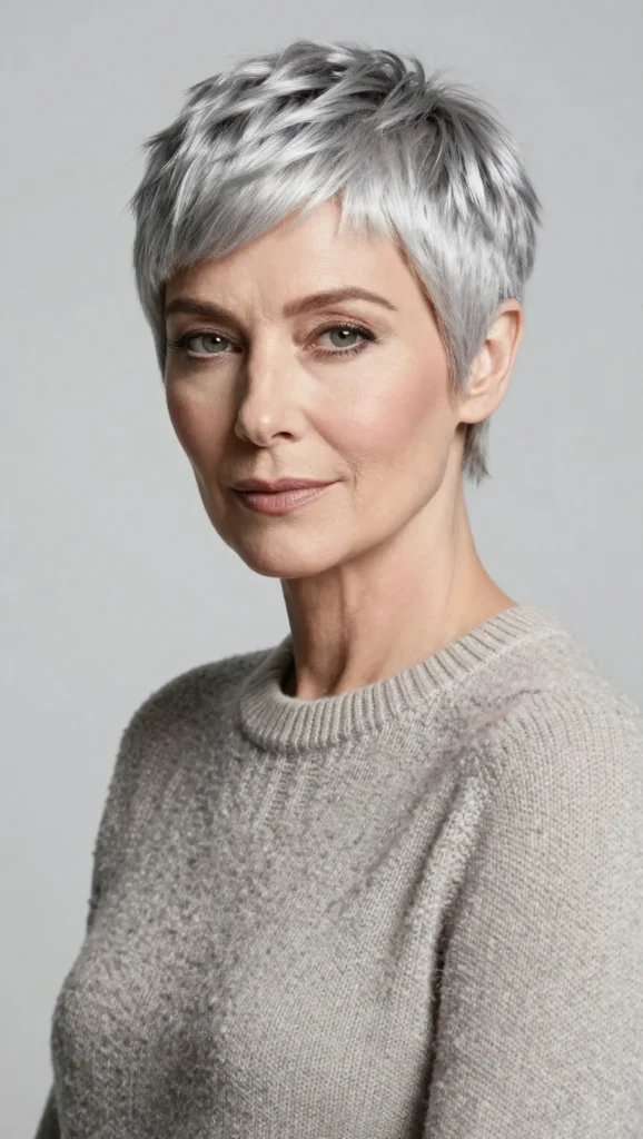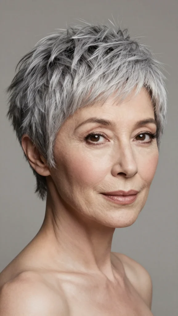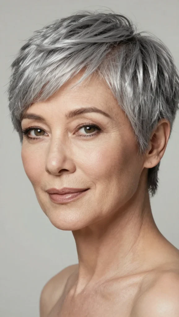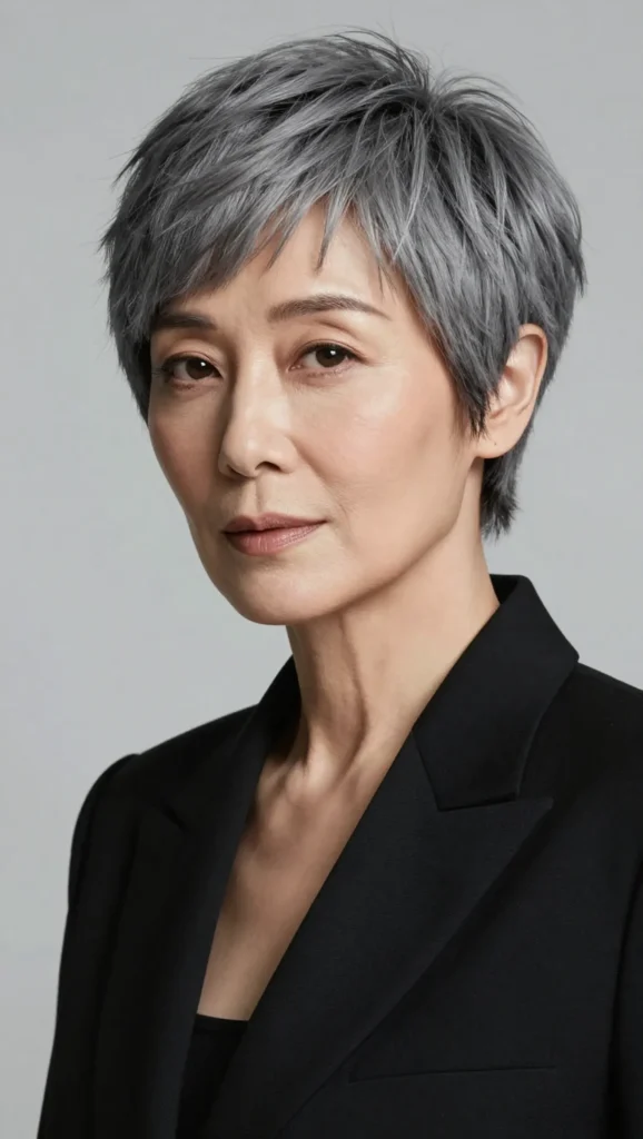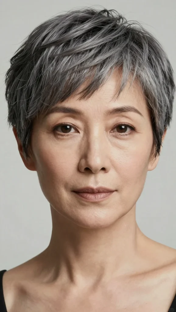 The classic pixie cut is timeless and effortlessly chic. This short gray hairstyle works beautifully with natural gray tones, creating a clean and polished appearance.