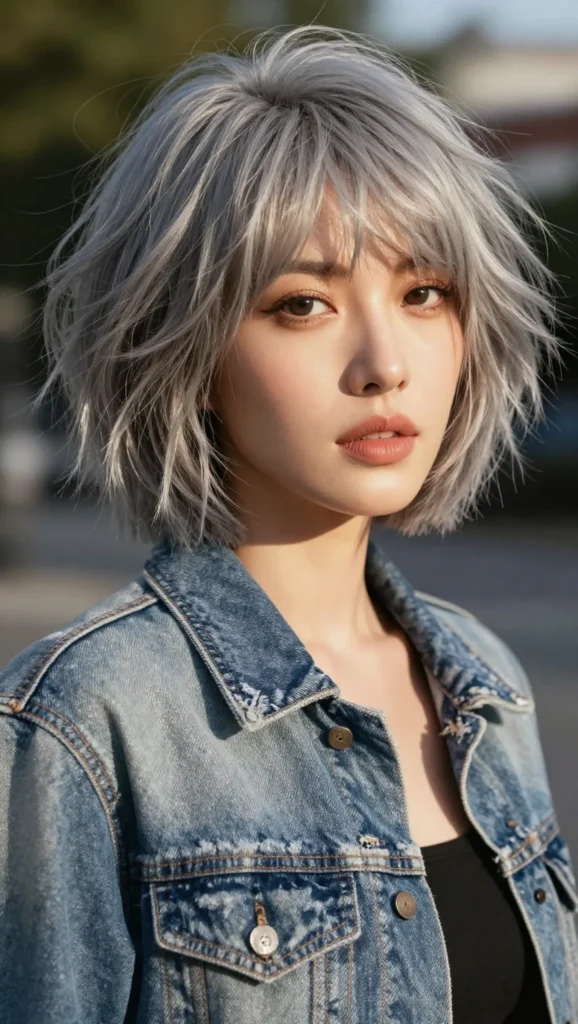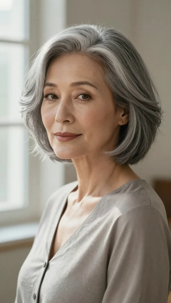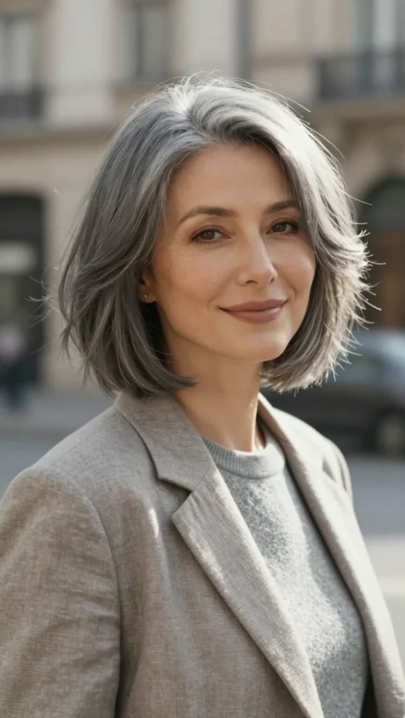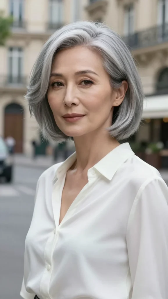 The French bob is a sophisticated short hairstyle that pairs beautifully with gray or silver tones. This chin-length cut looks polished yet relaxed.