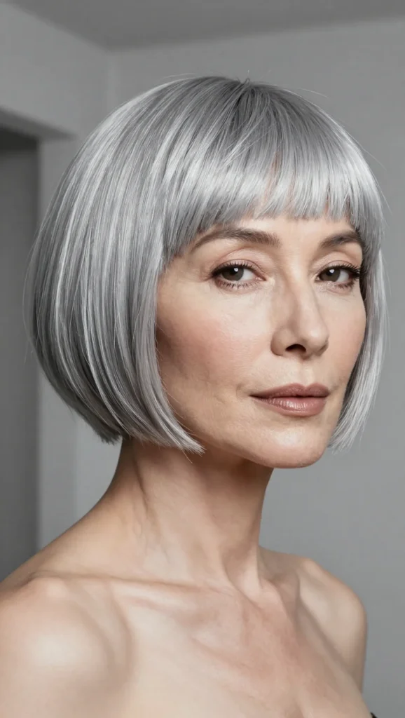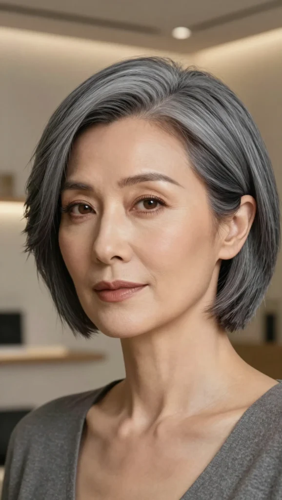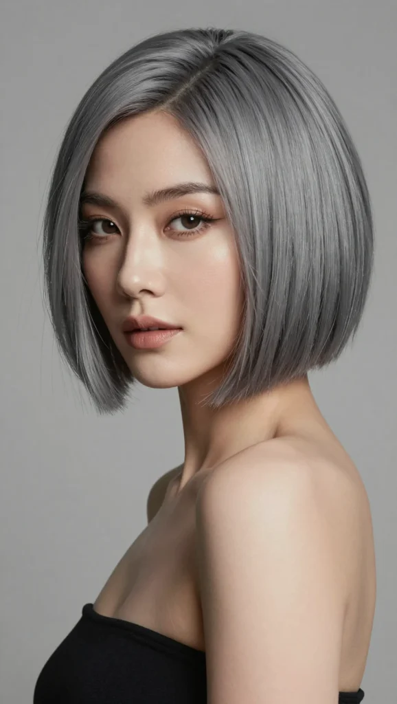 A blunt bob looks sleek and modern. Gray tones make this hairstyle sophisticated.