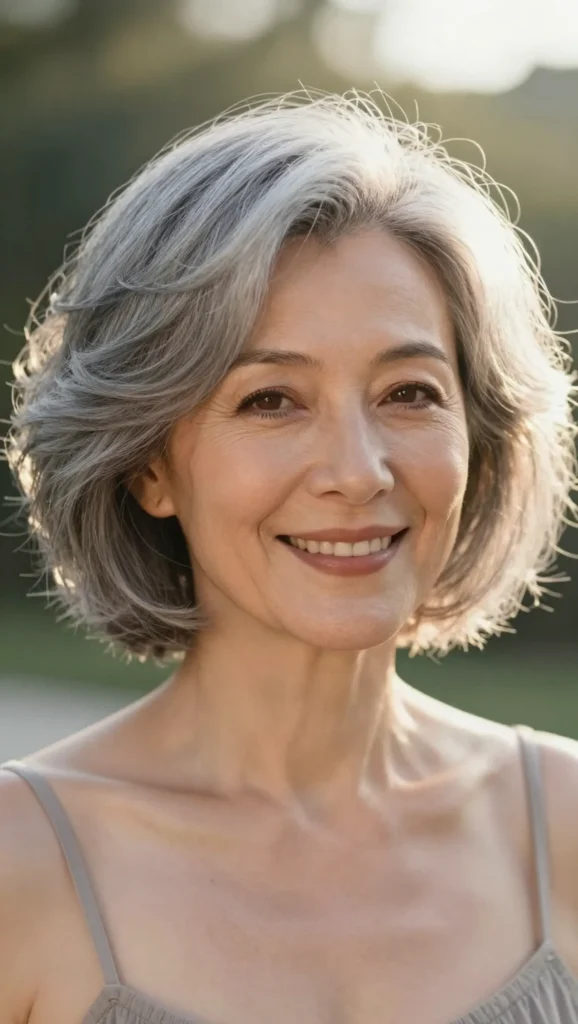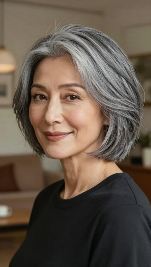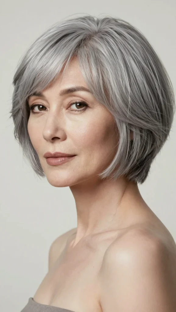 A layered gray bob adds dimension and volume to short hair. The layers create movement, making this hairstyle ideal for fine or thinning hair.