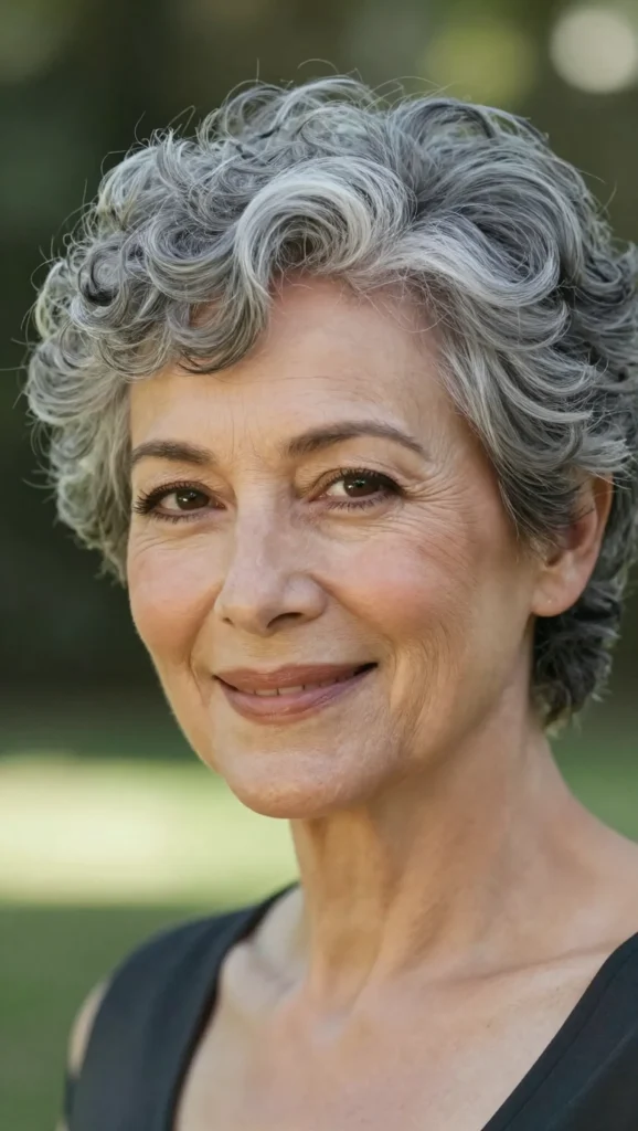 Curly gray hair looks stunning in short styles. This haircut enhances natural curls and adds volume.
