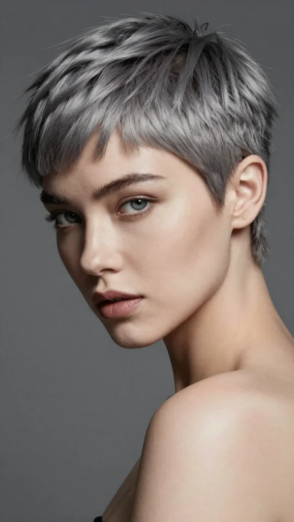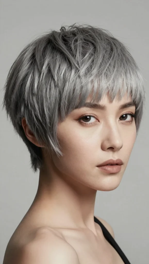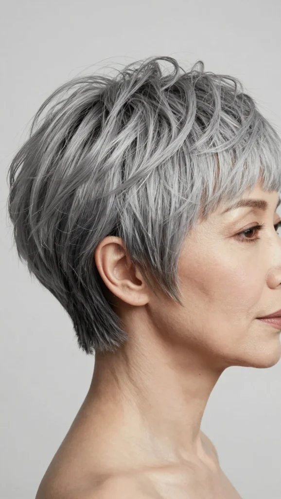 A tapered gray pixie is shorter at the back and slightly longer on top. This creates a sleek silhouette that looks polished and stylish.