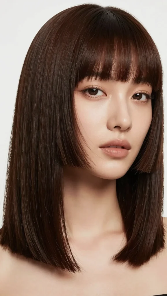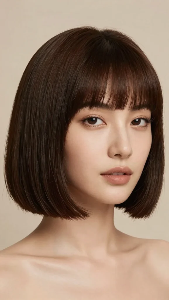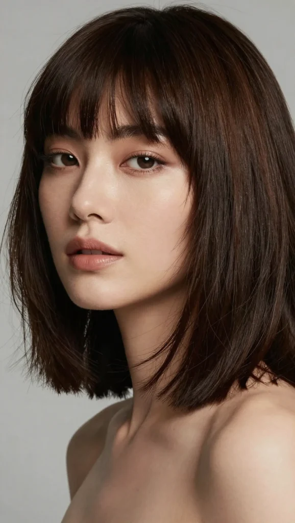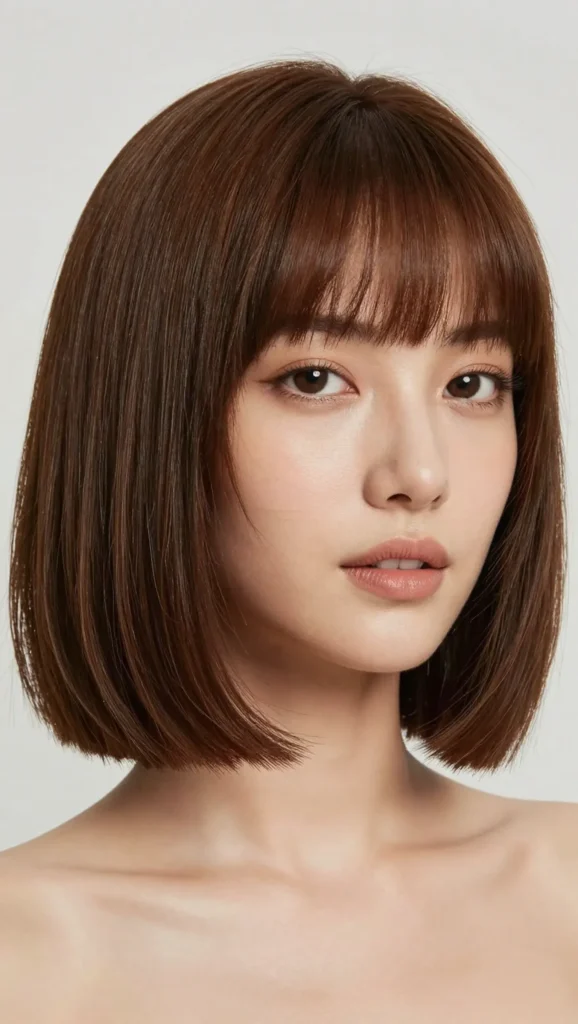 The chin-length bob with wispy bangs is simple yet elegant. The length frames the jawline, while the wispy bangs soften the forehead area.