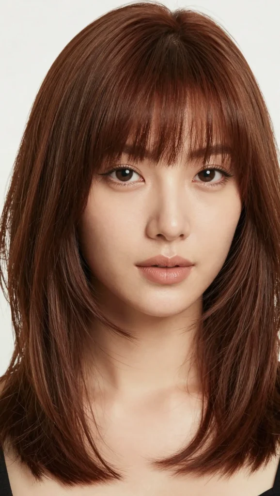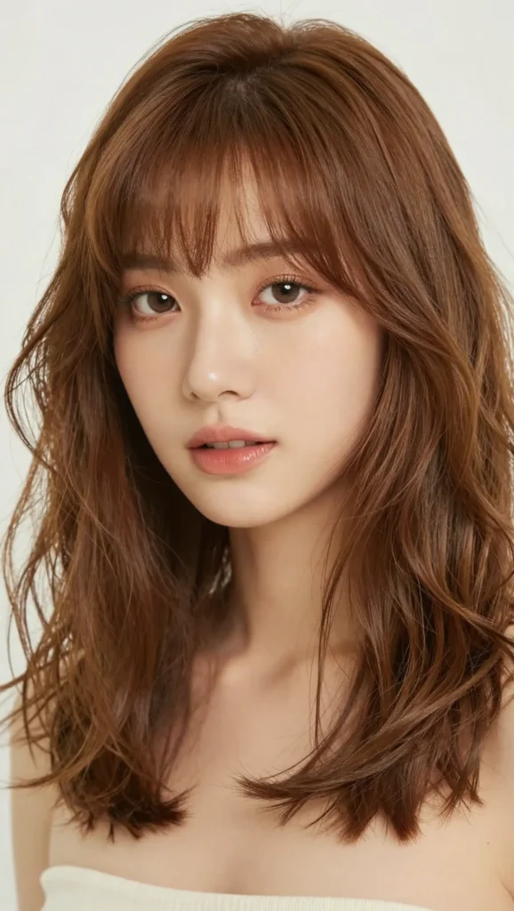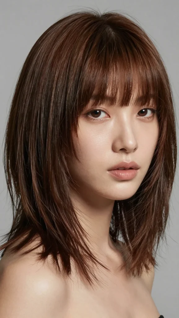 A layered lob (long bob) with feathered bangs offers the perfect balance between short and medium-length hair. The layers add volume and shape, while feathered bangs create softness.