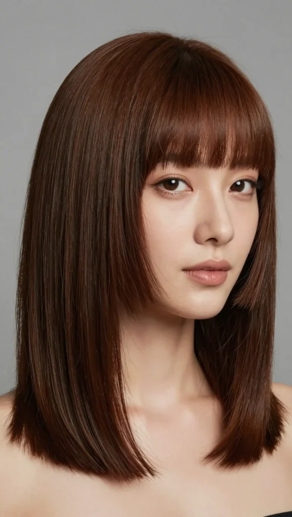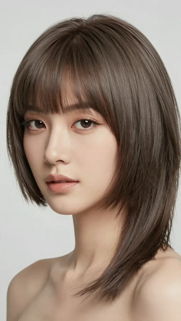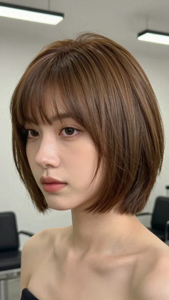 This hairstyle typically falls just below the chin, which helps elongate the face. Side-swept bangs soften the overall appearance while adding movement and dimension.