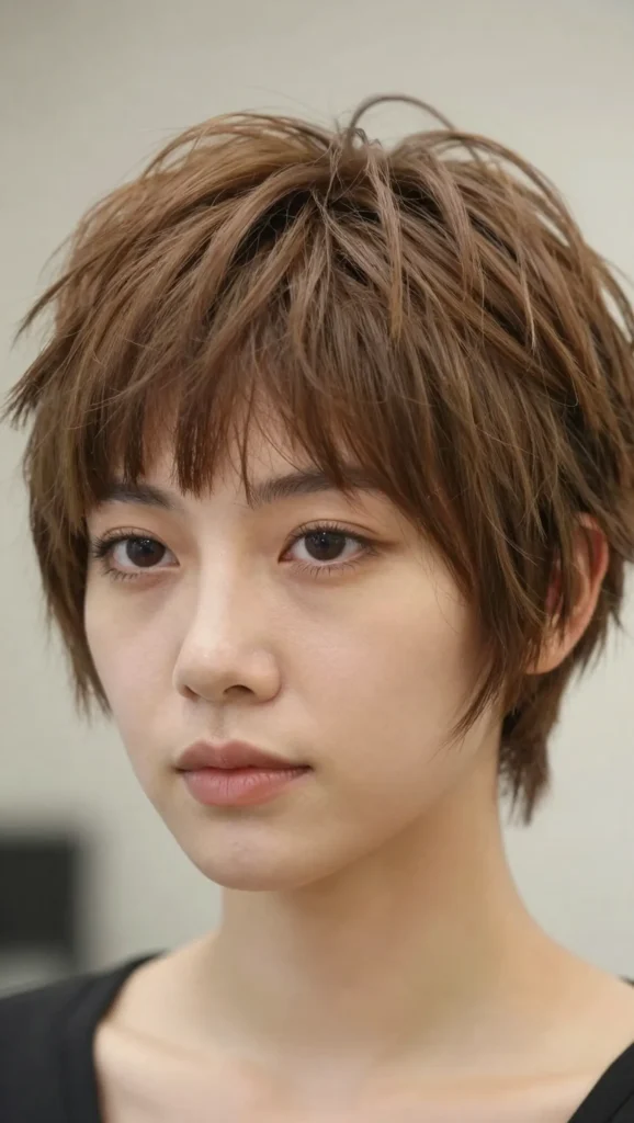 A messy pixie cut with textured bangs gives off a playful and effortless vibe. The messy layers add height at the crown, which helps elongate the face.