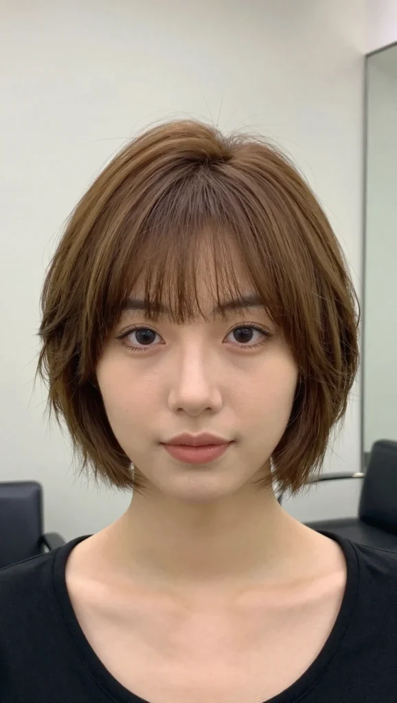 For round faces, this haircut works best when the crown is slightly lifted, and the face-framing pieces are longer and feathered. This prevents the sides from appearing too full.