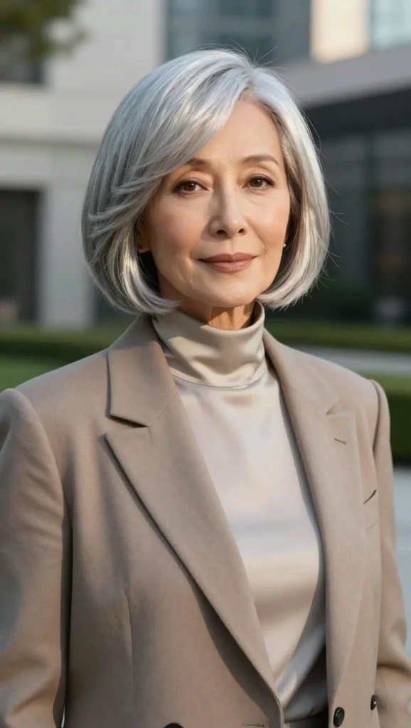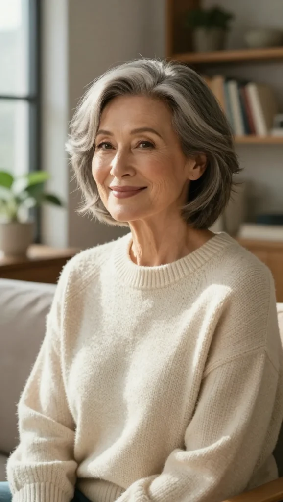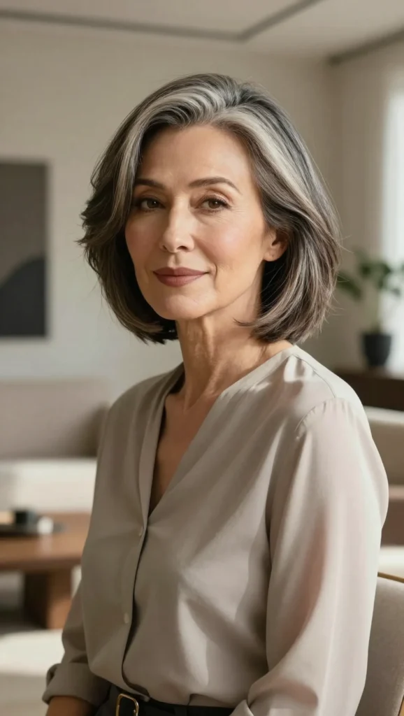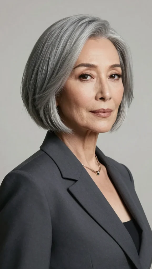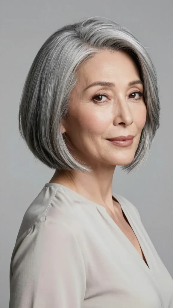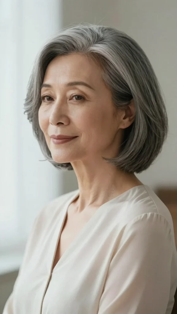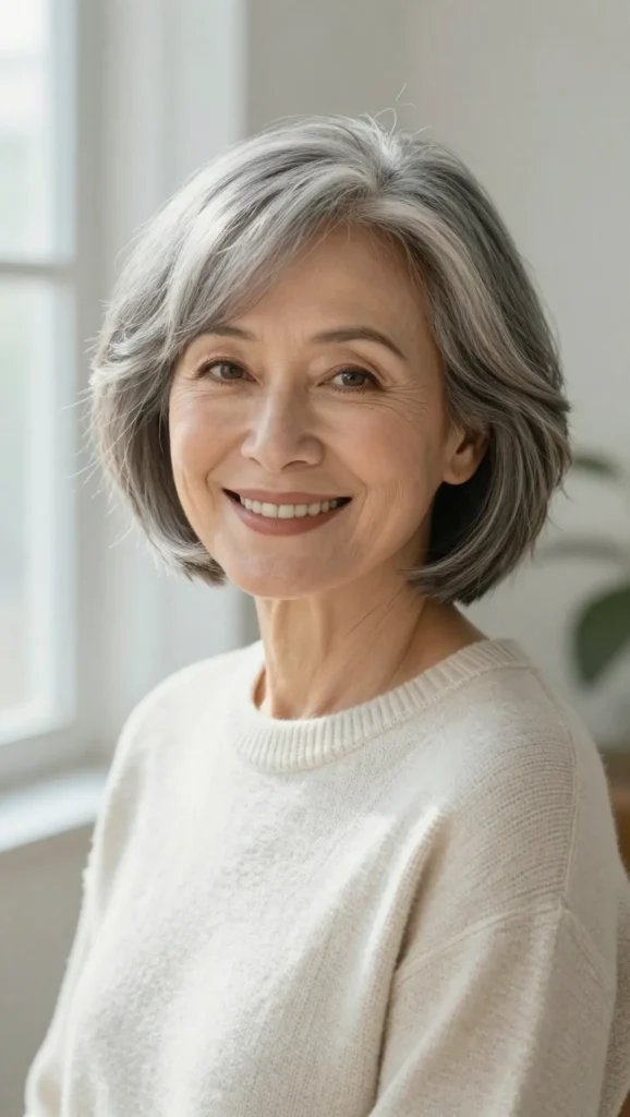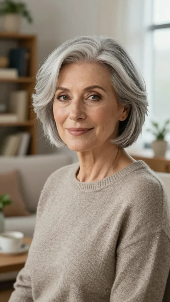 A chin-length bob is elegant and flattering for women over 60. It frames the face beautifully and adds softness.